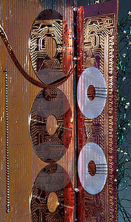 Ode To Science closed and detail of inside. Presented to the National Science Foundation at their 50th birthday celebration. Given by the Oregon Graduate Institute . open 18 x 48 x 6 a triptych form was chosen because of its versatility to sit on a desk or hang on a wall. A triptych is often used in religious paintings, and connotes reverence. The inscription is inside the large circle, a very old hard disk. |