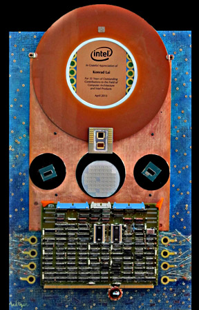 History computer parts, beads, and other found objects on painted and collaged wood 29 x 19 x 1 Retirement Gift for Intel department head who designed many of the computer parts in this piece. The title comes fron the objects that show his personal history with Intel and the history of computer hardware. Other objects are from the artists collection including hard disks from different periods, lock washers, resistors, circuit boards, copper board (drilled but not filled), and a typewriter ball. Beads and the resistors were imbedded in the paint. |