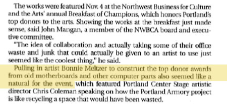 Northwest Busiiness for Culture & the Arts Awards for top doners to the arts antique mother boards and other found objects. Award were of different colors wmbellished with a variety of found objects. The award on the right was for key bank so used a key motif. Closed" 9 x 6, opened 6 x 12 below, exerpt from the Daily Journal of Commerce