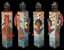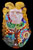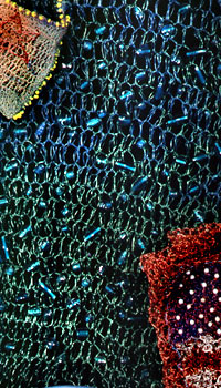 Gardener beaded crocheted wire, reflectors and other found objects on painted aluminum and copper 72 x 48 x 1 Commissioned for an outside patio to hang on a retaining wall. There are plants growing on the gardening bed at the top of the wall and many pots of plants at the base. The sunglasses and some shapes on the skirt are reflectors which shine at night. |
