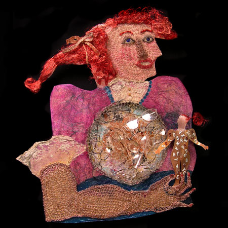 In Sight crocheted wire, found objects on painted wood and metal 30 x 34 x 3 One of the cut out series made by cutting a void in the wood exposing a deeper layer or letting us see through a transparent veil. This one is about gaining insight through the melding of intellect and emotions. |