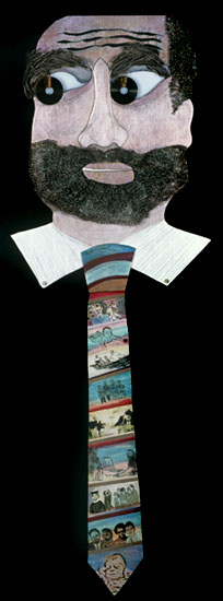 Connected beads, crocheted wire, found objects, fabric, maps on painted mannequin 34 x 24 x 11 This piece was partial made during an exhibition where visitors to the gallery could participate by adding beads with pins. Meltzer designed the piece and made a great deal of it but participants had some decision making in their additions. This was the first of many collaborative projects. |