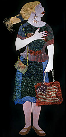 Shop For America crocheted wire with beads, found objects on painted wood 68 x 27 x 4 |