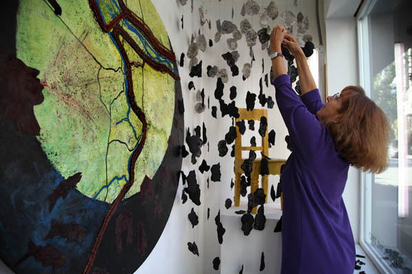 3 DOWN, 3 TO GO found objects, paint, maps, fabric, beads, glitter, crocheted wire variable configurations and sizes, painting 46" diameter A title change and additional collage elements were made for the January 2014 University of Portland exhibition to reflect the three eliminated train routes out of the 6 original proposals for coal terminals in the Northwest. The text collaged along the eliminated routes are the reasons for the withdrawal of the applications . As of September 2014 the permit was denied for the 4th proposal but that coal company has sued the state of Oregon. The two other proposals are in the midst of the permitting process. See the original 2012 window to the left. The installation can be hung in many environments and configurations to fit a space. It is available for exhibit and purchase. |