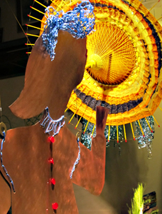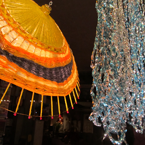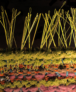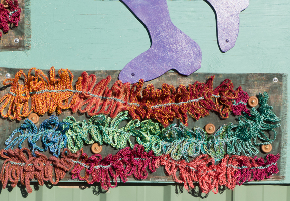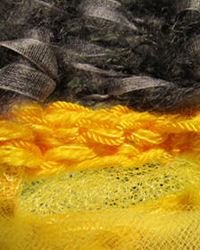 Detail of the grass component of the installation on the left shows the woven and crocheted wool and the heddles used as blades of grass. Both give homage to the Brownsville Woolen Mill. Heddles are the part of a loom through which the yarn gets threaded. On the right is a detail of the many materials used in weaving and crocheting the umbrella. |