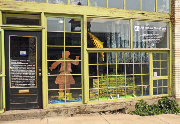RAIN MAKES THE GRASS GROW ...and everything else Window Installation Art in Rural Storefronts Bonnie Meltzer was selected by the Corvallis Art Center and the city of Brownsville to create a window installation as part of the Art in Rural Storefronts program. Motifs evolved from the climate (rain), the crops (grass seed) and the historical Brownsville Woolen Mill. More views to the right. #windowart |