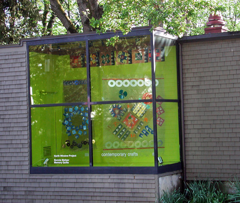 COMPUTER QUILTS floppy disks and other computer parts, beads on screen window installation 2005 A quilt exhibition was inside the gallery. This installation was made for the window to complement the quilts inside. The floppy disks became the design blocks, corresponding to fabric blocks used in fabric quilting. Screening is a woven fabric but made with wire instead of yarn. |