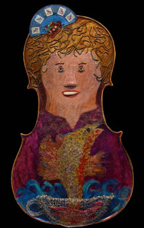 Fishing for Inspiration painted and collaged cello, crocheted wire, beads, 45 rpm record and other found objects 29 x 16 x 5 "As an artist who is always looking for ideas I am still amazed that sometimes an idea jumps out of my coffee cup or pops into my head like an old song." |