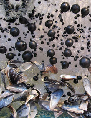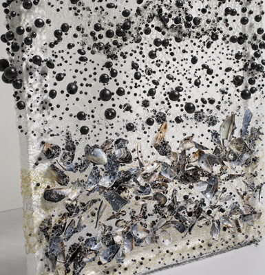 Particulate Matter crocheted fishingline, beads, shells stretched on metal frame 65 x 19x 4 The subject of coal dust and particulate matter is also addressed in the installation 3 Down, 3 To Go. In this piece fishingline was used for both its transparency and for its connection to water. Air pollution and water pollution are twins, each affects the other. |