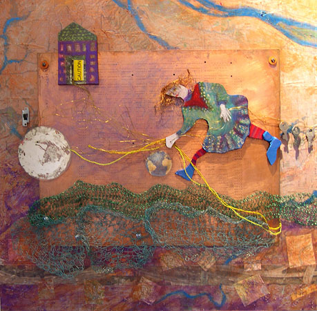Bequest digital photography, found objects and crocheted wire on painted wood left and right panels 57 x 19 x 3 each center panel 57 x 33 x 3 Made for " Sustaining Change on the American Farm", Maryhill Museum, Goldendale, Washington. Twelve artists, paired with twelve farmers, visited their respective farms then constructed artworks about sustainable agriculture. Meltzer used the three panels to tell about land use, farm families, and the problems of growing food. Links |