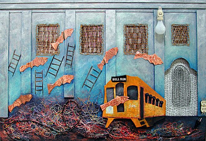 Making Electricity found objects, wire on painted wood 33 x 48 x 3 Originally made for the traveling exhibiton Art Contemplates Industry: Bull Run. Twenty artists were invited to the Bull Run electric generation plant after it was closed and the dam destroyed. The plant was originally built to make electricity for trollies. Links |