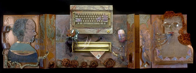 Talk To Me personal artifacts, maps, found objects on painted metal 64 x 24 x 7 "Talk To Me" was commissioned to hang over a fireplace. The owner of the piece is an educator who specializes in helping people to communicate better. She also had the last letter her mother had written to her. Now, instead of being in a drawer the letter is enshrined behind one of the doors. |