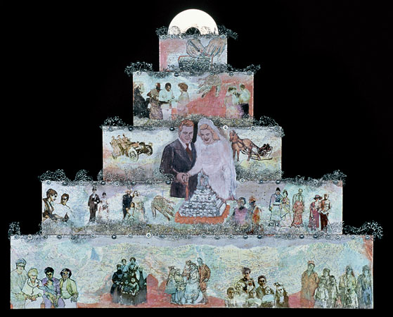 Wedding Cake - One Family family photographs, maps, found objects, crocheted wire on painted wood 30 x 36 x 4 The photographs for this wall sculpture were collected from friends and family with relatives of mixed ancestry. One marries the spouse, the family, the ethnic group along with all the customs, holidays and food. |